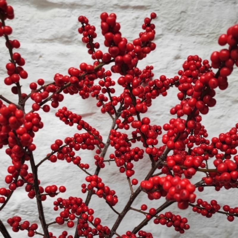 All you need for a chic festive centrepiece, tall vibrant red Ilex berries and a bottle green vase.