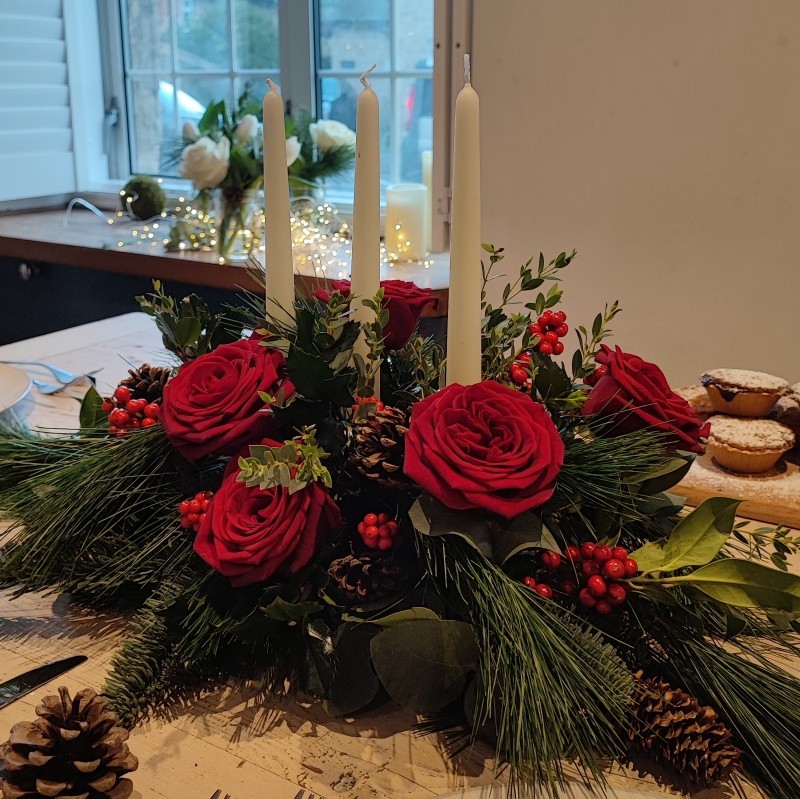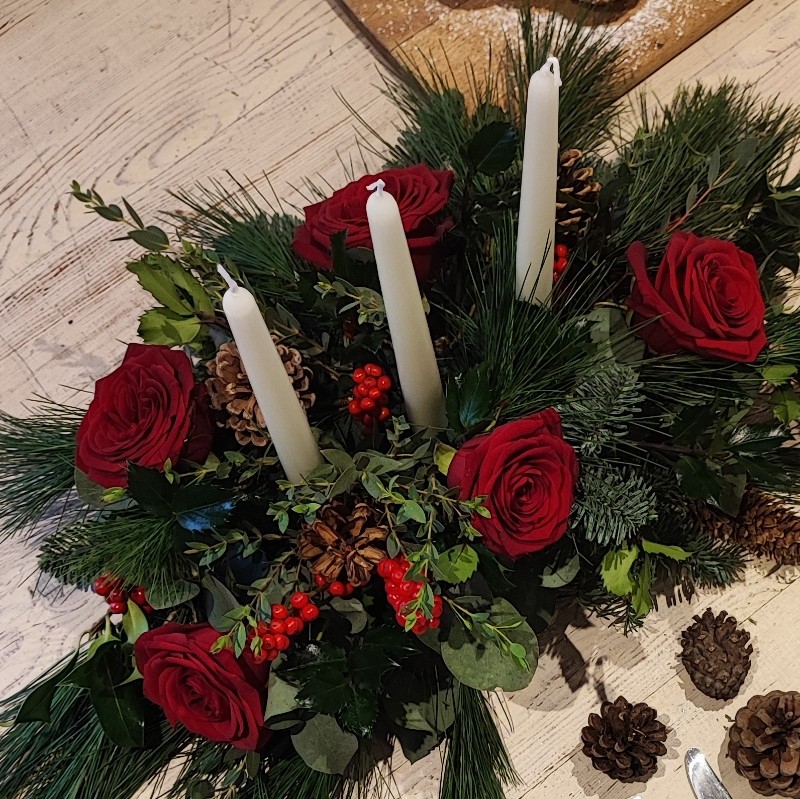 A classic for the dinner table or window sill. Complete with three taper candles, a mix of fresh winter greenery, red roses, berries and cones.
