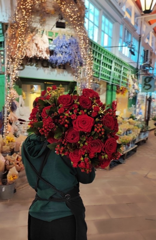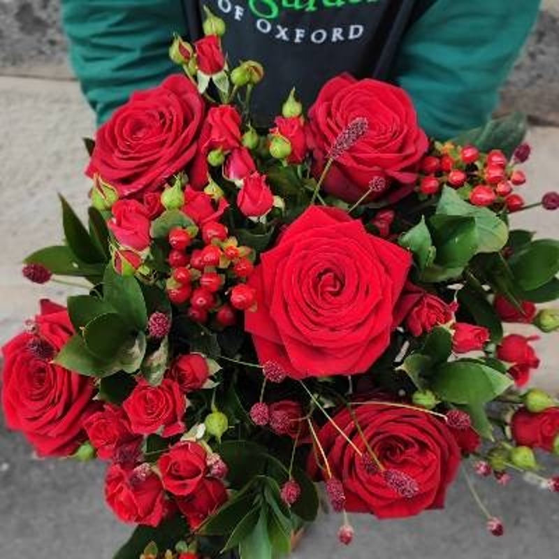 A bouquet of our favourite, long stemmed "Naomi" roses in a red toned mix.
